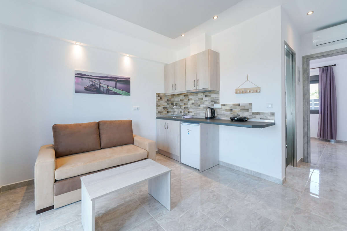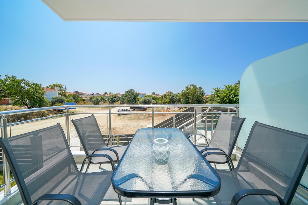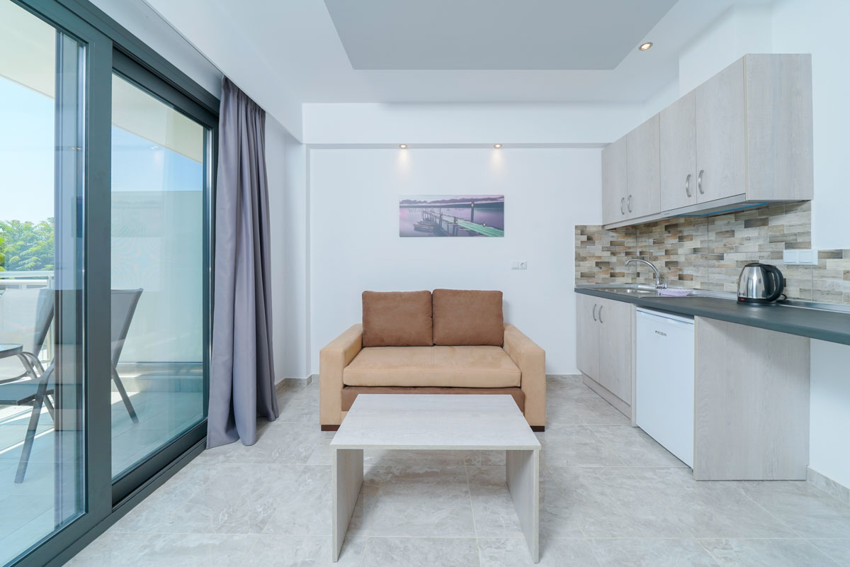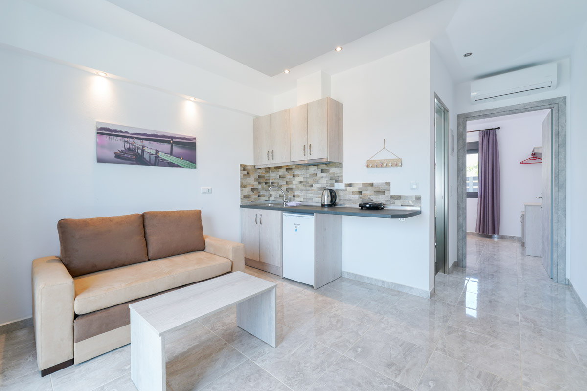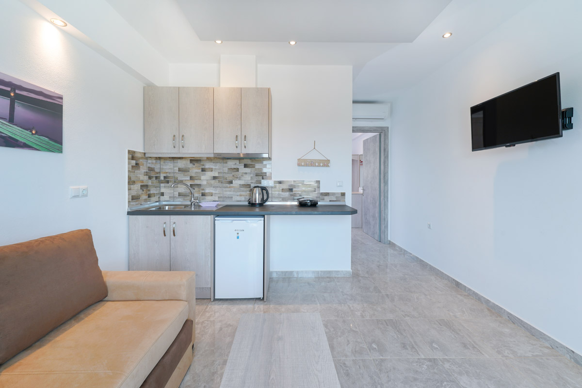Το διαμέρισμα είναι ευρύχωρο και ξεχωρίζει με τη μοντέρνα διακόσμησή του, είναι ιδανικό για οικογένειες καθώς μπορεί να φιλοξενήσει έως και τρεις ενήλικες ή δύο ενήλικες και δύο παιδιά. Δύο ενήλικες μπορούν να κοιμηθούν στο διπλό κρεβάτι του υπνοδωματίου ενώ ένας ενήλικας ή δύο παιδιά μπορούν να χρησιμοποιήσουν τον διπλό καναπέ-κρεβάτι που υπάρχει στο σαλόνι. Επιπλέον, το διαμέρισμα διαθέτει κουζίνα εξοπλισμένη με κουζινάκι και διάφορα μαγειρικά σκεύη και μοντέρνο ιδιωτικό μπάνιο. Τέλος, το διαμέρισμα έχει άμεση πρόσβαση σε επιπλωμένο μπαλκόνι με υπέροχη θέα.