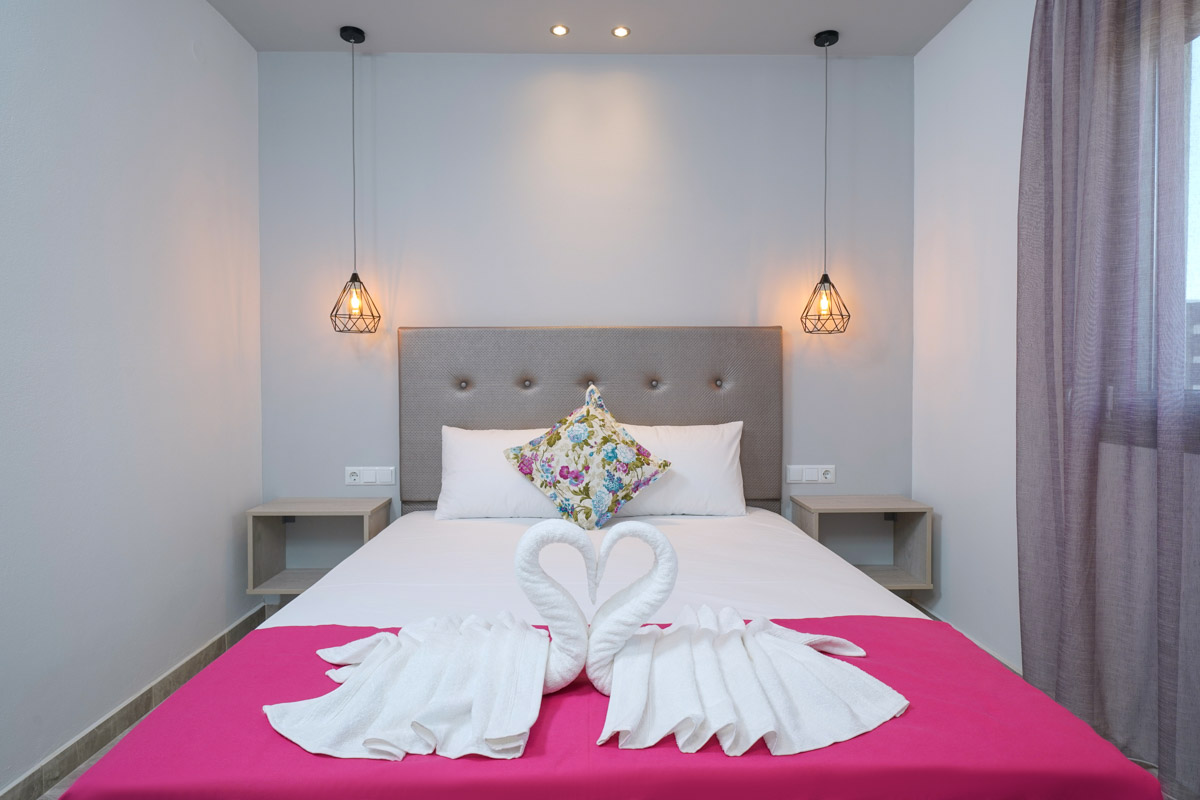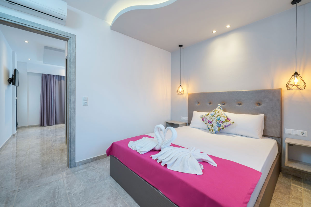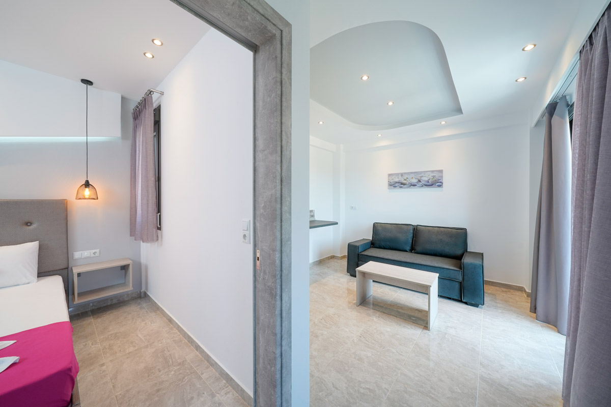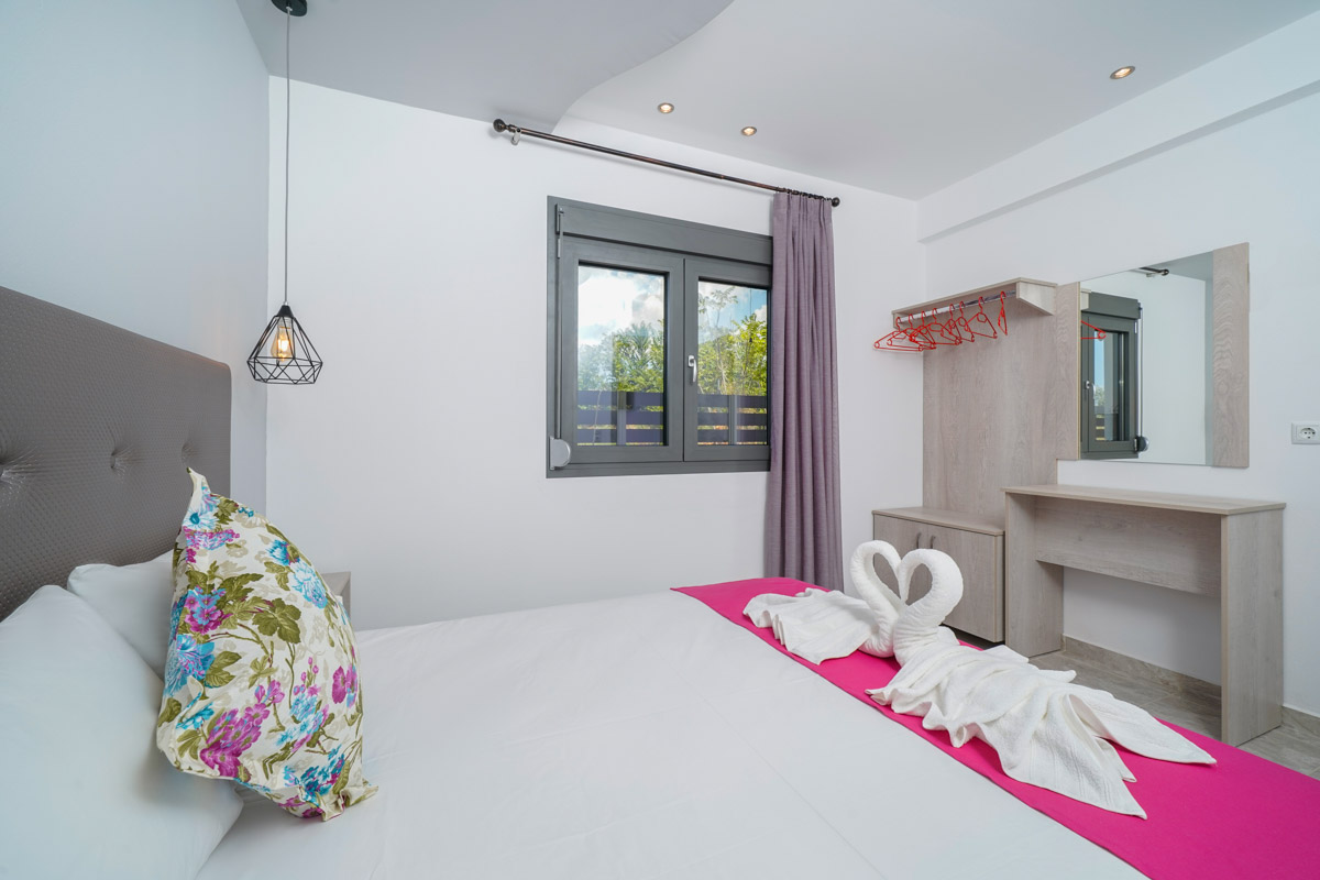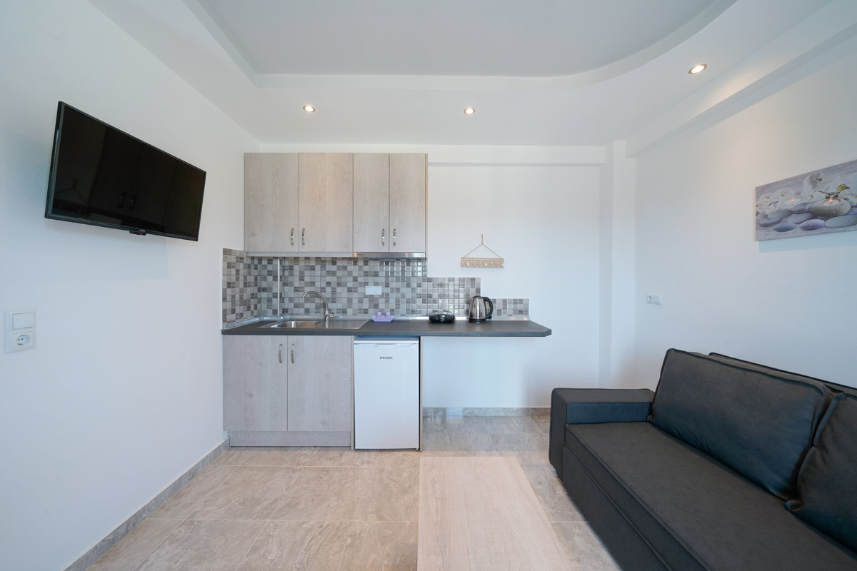 Το διαμέρισμα είναι ευρύχωρο και ξεχωρίζει με τη μοντέρνα διακόσμησή του, είναι ιδανικό για οικογένειες καθώς μπορεί να φιλοξενήσει έως και τρεις ενήλικες ή δύο ενήλικες και δύο παιδιά. Δύο ενήλικες μπορούν να κοιμηθούν στο διπλό κρεβάτι του υπνοδωματίου ενώ ένας ενήλικας ή δύο παιδιά μπορούν να χρησιμοποιήσουν τον διπλό καναπέ-κρεβάτι που υπάρχει στο σαλόνι. Επιπλέον, το διαμέρισμα διαθέτει κουζίνα εξοπλισμένη με κουζινάκι και διάφορα μαγειρικά σκεύη και μοντέρνο ιδιωτικό μπάνιο. Τέλος, το διαμέρισμα έχει άμεση πρόσβαση σε επιπλωμένο μπαλκόνι με υπέροχη θέα.